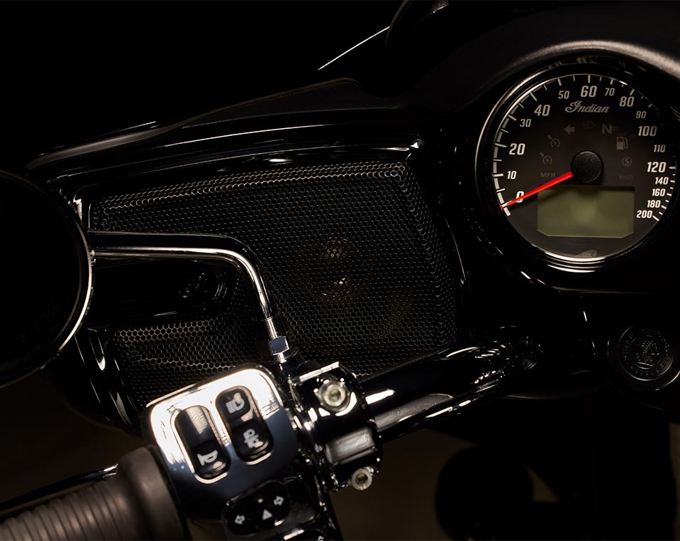 | Standard Equipment | Smart Lean Technology; Electronically Adjustable Rear Suspension Preload; Heated Seat; Integrated Driving Lights in Lower Fairing; Lower Fairing Storage; 7" touchscreen powered by Ride Command with Navigation and Apple CarPlay integration; Selectable Ride Modes; Rear Cylinder Deactivation; Cruise Control; Tyre Pressure Monitoring; Remote-locking Hard Saddlebags & Trunk; 136+ litres of Storage; Highway Bars; Adjustable Passenger Floorboards; Brembo brakes; ABS; Keyless Ignition; Chassis Mounted Fairing; Power Windshield; Adjustable Fairing Air Flow Vents; Heated Grips; 200 Watt Audio System with AM/FM, Bluetooth, USB, Smartphone Compatible Input, and Weatherband; 12V Charging Port |
